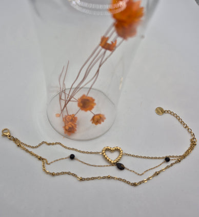Bracelet triple chaîne dorée avec pierres noirs et cœur.