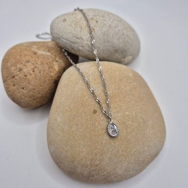 Collier chaîne fine torsadée argentée avec pierre ovale cristal.